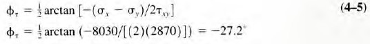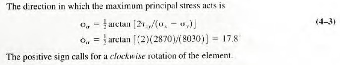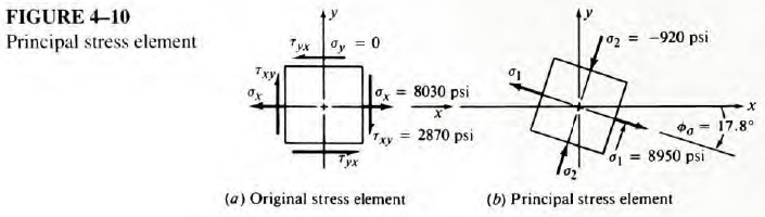 The principal stresses can be shown on a stress element as illustrated in Figure 4-10. Note that the element is shown in relation to the original element to emphasize the direction of the principal stresses relation to the original x-axis. The positive sign for ϕσ indicates that the principal stresses element is rotated clockwise from its original position.