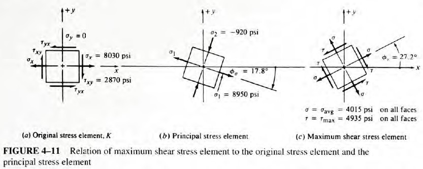 Comments:    Figure 4-11 shows the stress element on which the maximum shear stress acts in relation to the original stress element. Note that the angle between this element and the principal stress element is 45°.