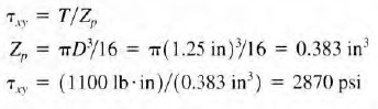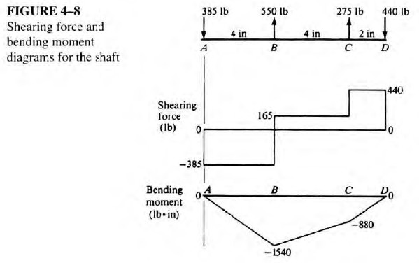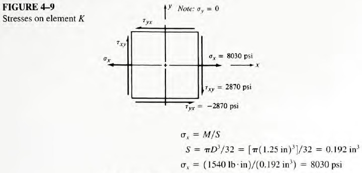 Results:        Element K is subjected to bending that produces a tensile stress acting in the x-direction. Also, there is a torsional shear stress acting at K. Figure 4-8 shows the shearing force and bending moment diagrams for the shaft and indicates that the bending moment at K is 1540 lb-in. The bending stress is therefore